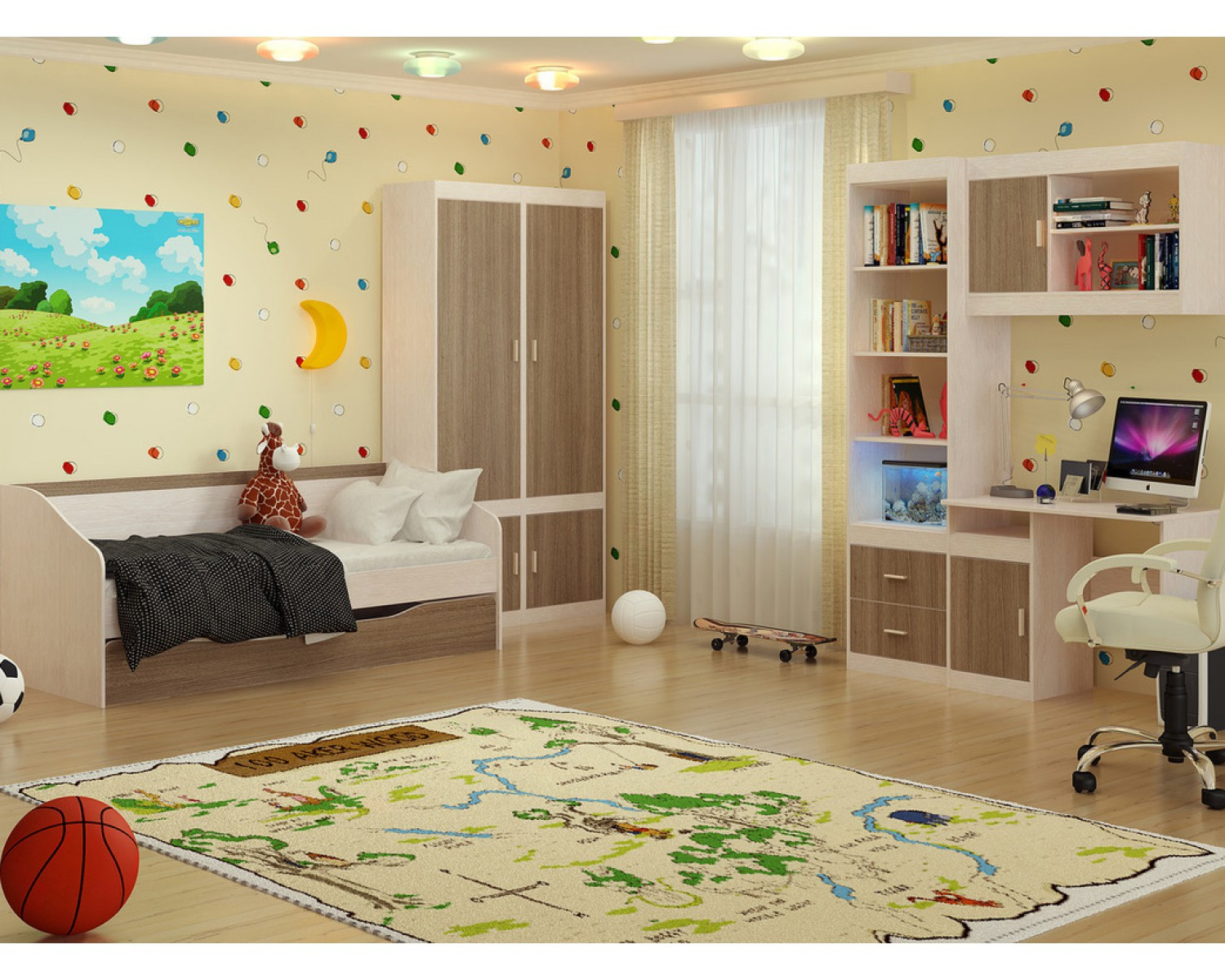 Модульная система детской Пьер- когда взрослые предметы интерьера отлично адаптировались в детской комнате! Вместительный пенал для вещей, пенал с выдвижными ящиками и полками для книг, удобный письменный стол с тумбой, навесную полку и многофункциональную кровать можно разместить по своему усмотрению, создавая свой собственный интерьер. Выкатной (выдвижной) ящик расположенный в нижней части кровати можно использовать как дополнительное спальное место и как место для хранения игрушек и постельных принадлежностей. Все модули выполнены в современной, теплой цветовой гамме которая подойдет девочкам и мальчикам.