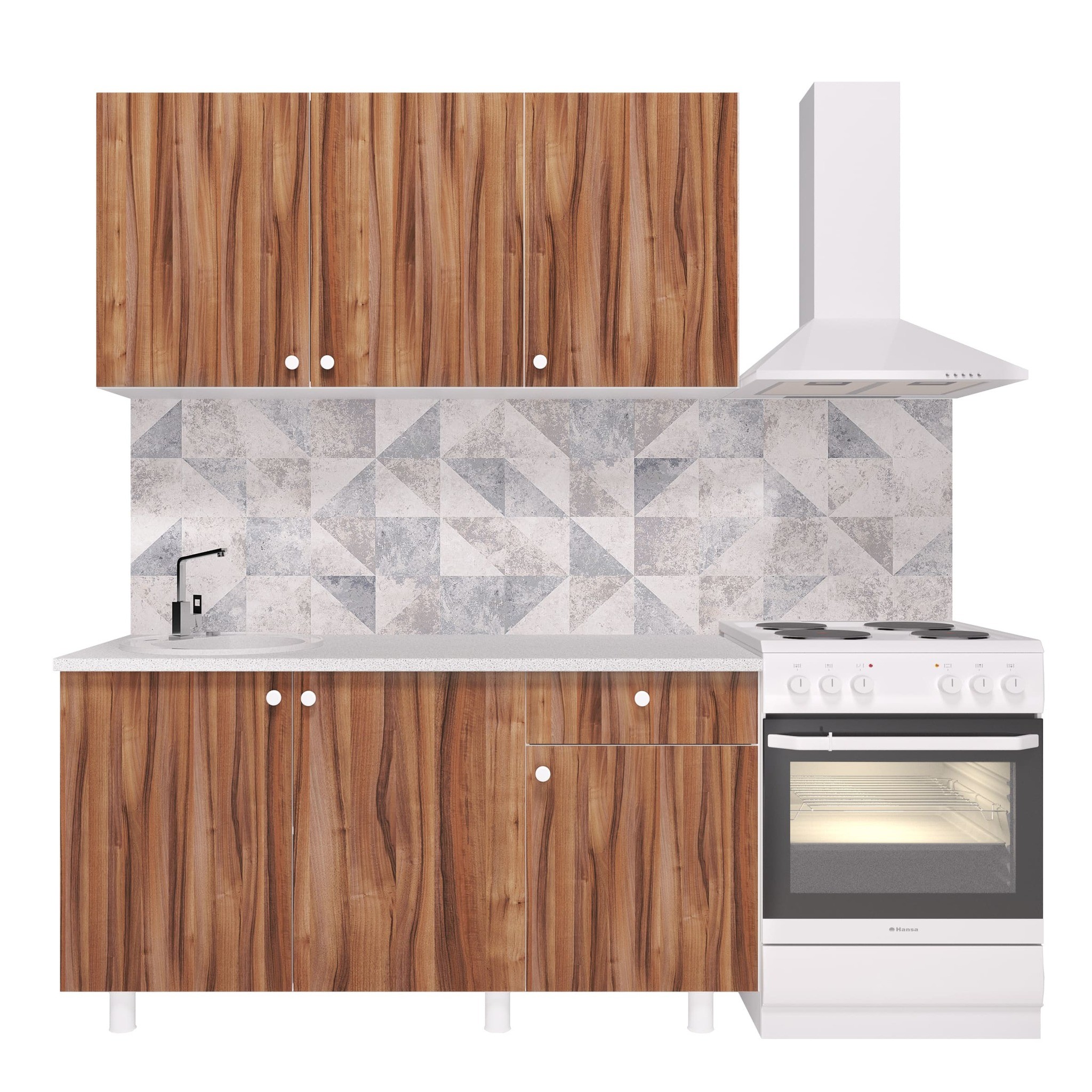 Шкафы поделены на два отделения 90 и 60 см. Рекомендована установка сушки 60 см. Возможно врезать мойку. Вылет столешницы можно менять.